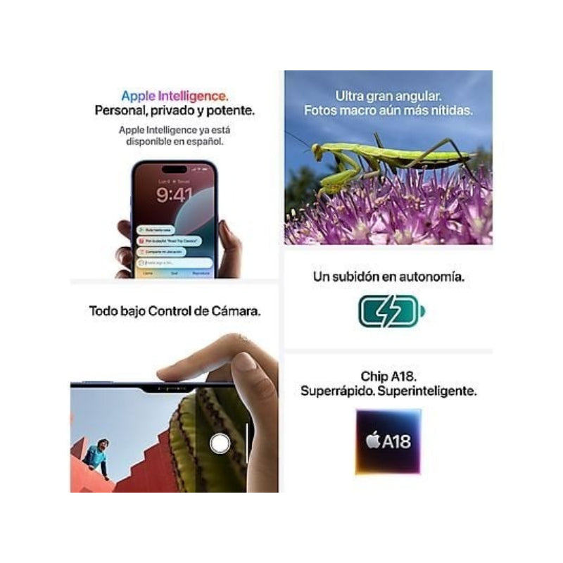 El iPhone 16 ha sido diseñado para un rendimiento de alta gama, integrando el Chip A18 Bionic y 8 GB de RAM para una ejecución fluida de aplicaciones y funcionalidades de inteligencia artificial. La pantalla OLED Super Retina XDR de 6,1 pulgadas garantiza una experiencia visual inmersiva con colores intensos y alto brillo.