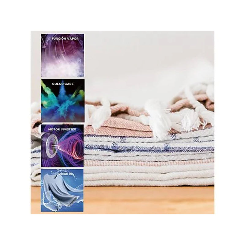 Cuenta con un total de 15 programas, incluyendo ciclos especiales como Rápido 15' y un programa con Función Vapor para una limpieza más profunda. A pesar de no llevar motor Inverter, su rendimiento es eficiente (Consumo 0.644 kWh/ciclo) y tiene una Clase de Eficiencia D. La velocidad de centrifugado es de 1000 rpm (Clase D), con un nivel de ruido de 78 dB(A) (Clase C). Dispone de pantalla LED, Detección de Carga y Bloqueo Infantil.
