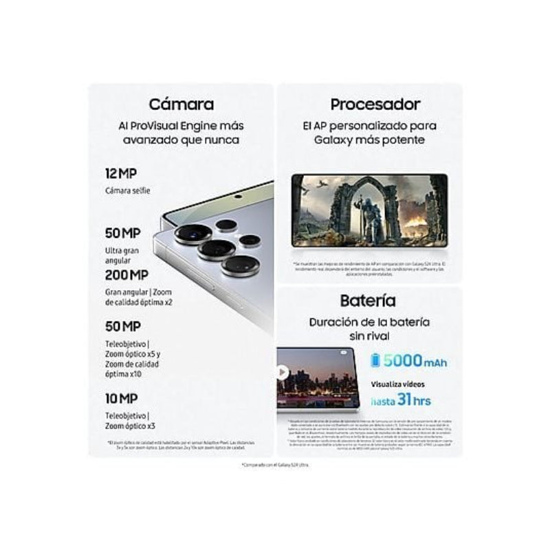 Su sistema de cámara cuádruple profesional incluye un sensor principal de 200 MP con OIS y láser AF, y sensores secundarios de 50 MP y 10 MP, permitiendo un zoom digital de hasta 100x. La cámara frontal es de 12 MP con Dual Pixel AF. El dispositivo integra Galaxy AI para funciones avanzadas como traducción en tiempo real. La batería de 5000 mAh ofrece una autonomía de hasta 44 horas 54 minutos por ciclo, compatible con carga rápida de 45 W. Cuenta con conectividad 5G, Dual SIM y certificación IP68.